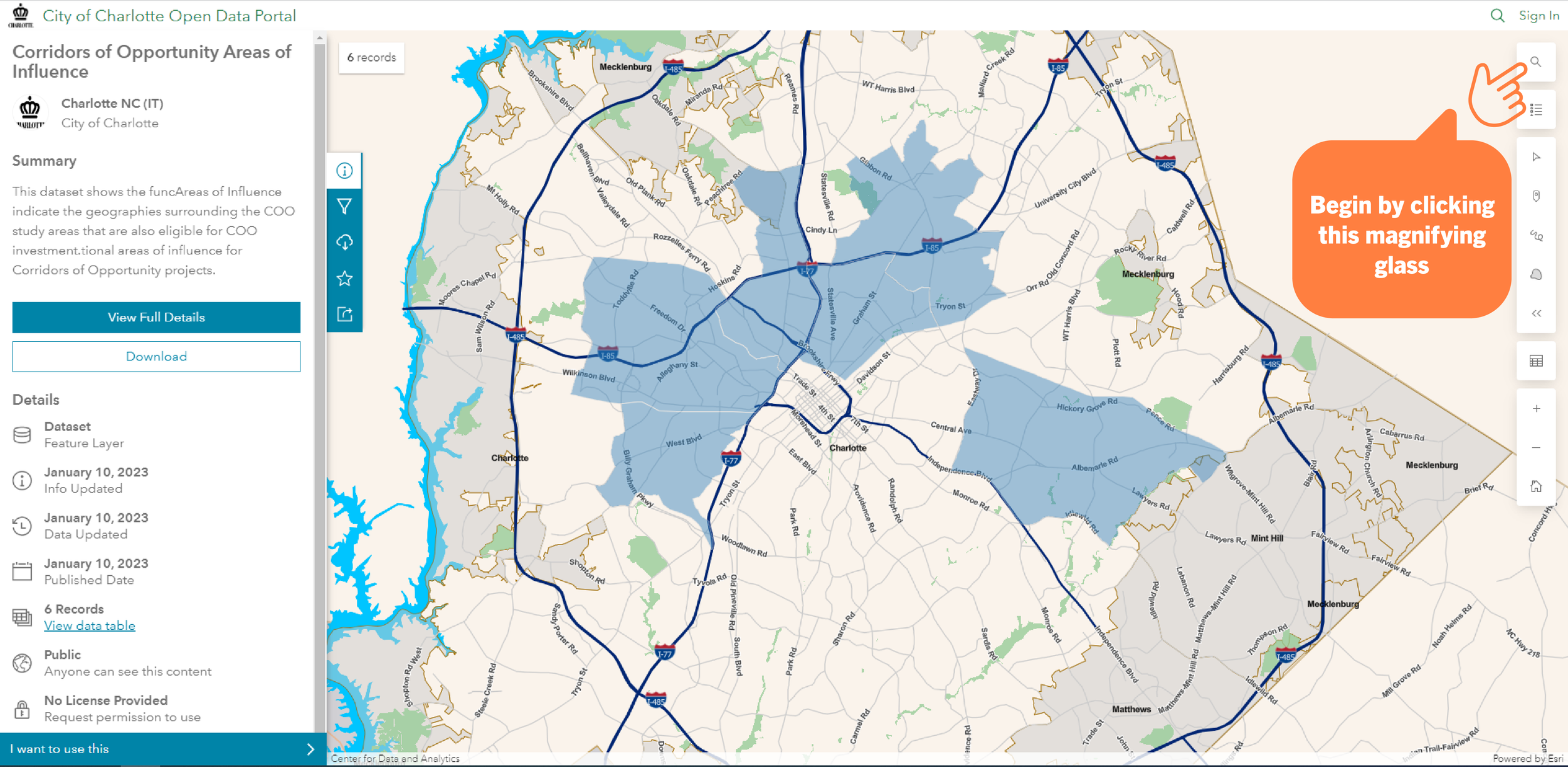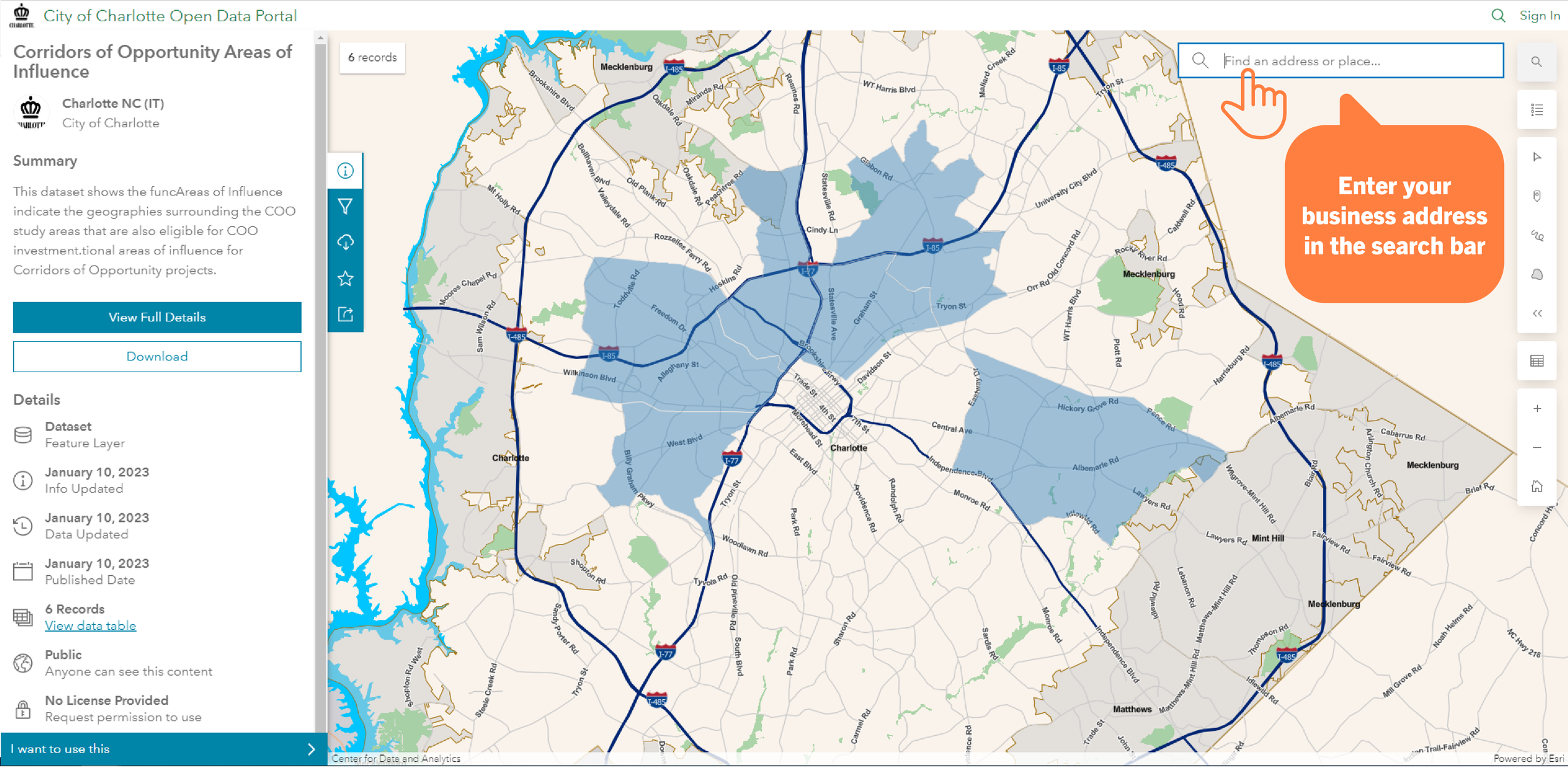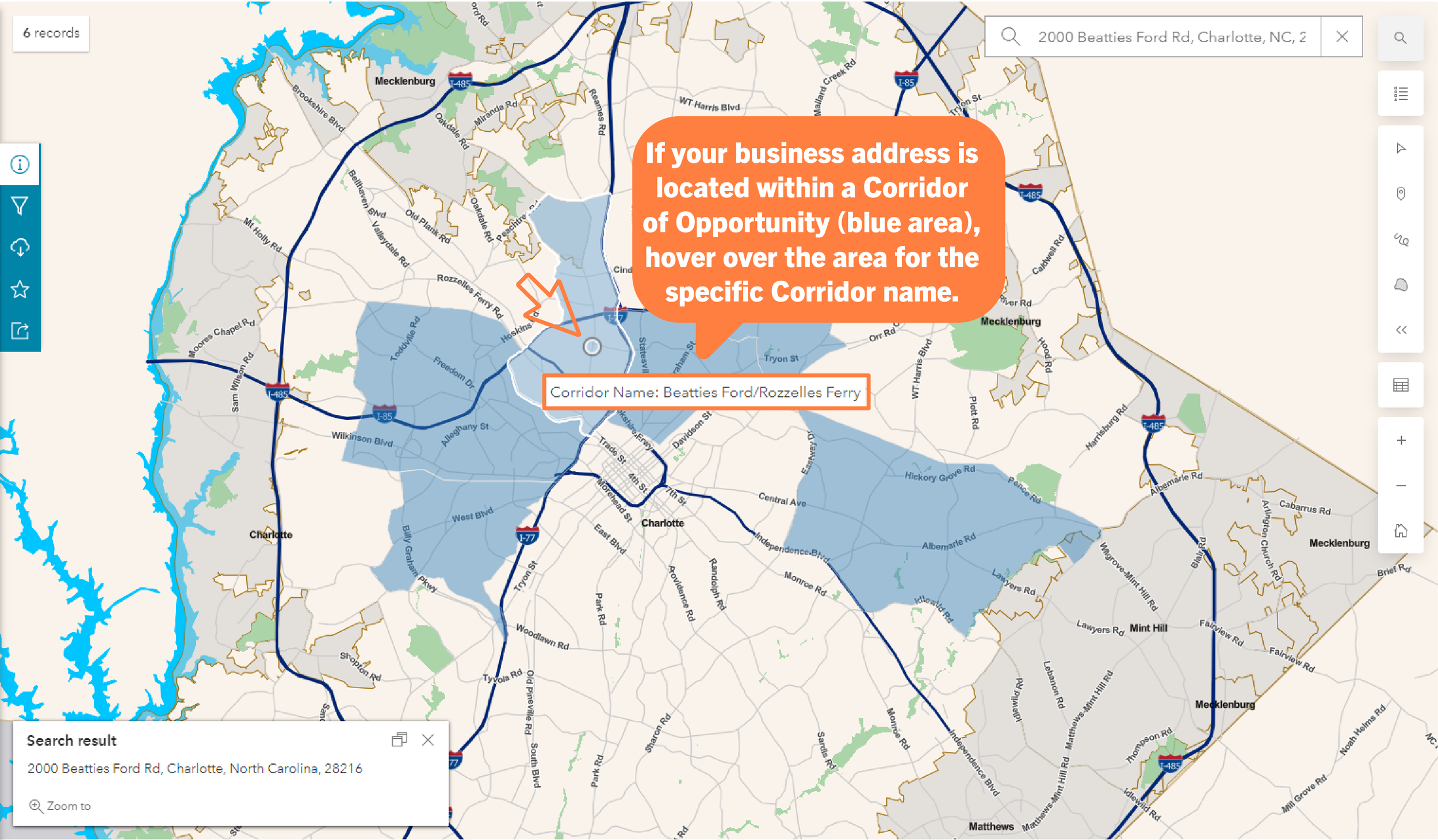 Click the button above to be taken to the City of Charlotte’s Open Data Portal to confirm if your business is located within a Corridor of Opportunity.